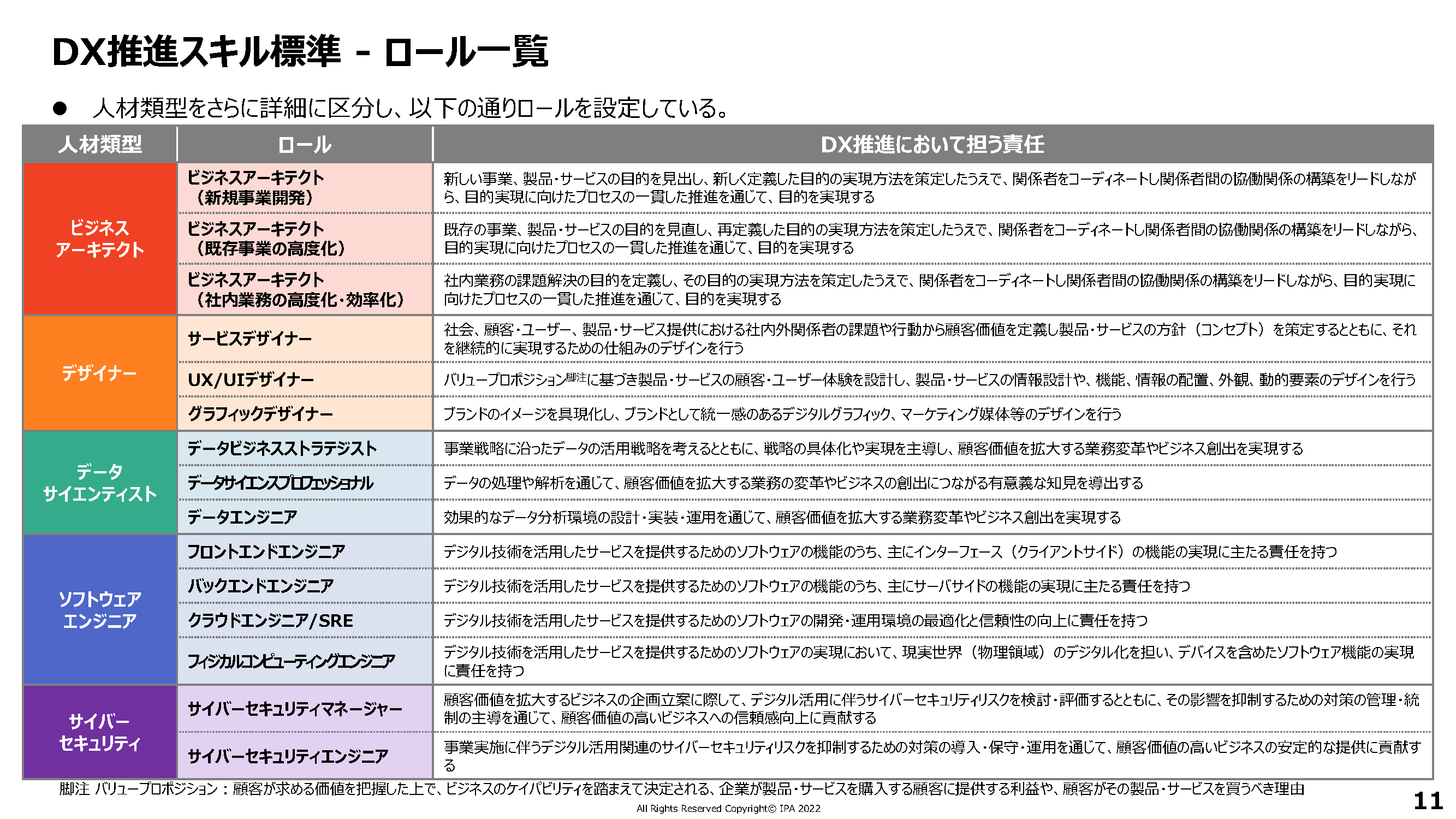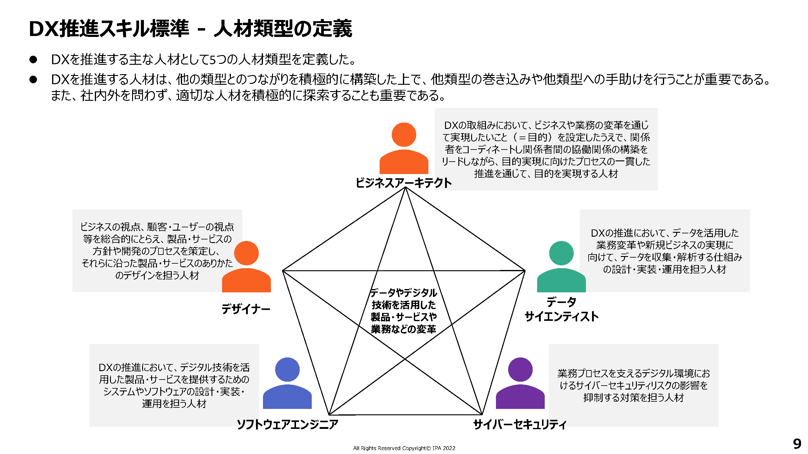 デジタルスキル標準ではDX人材のロールを5つに分けて定義している。ビジネスアーキテクト、データサイエンティスト、サイバーセキュリティ、ソフトウェアエンジニア、デザイナー。