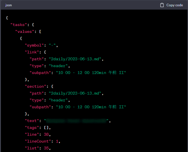 ChatGPTでDataViewを書いてもらって、エラーになったので、ChatGPTのコードをコピペして検索して、うまく行っているものを探した。で、途中でTaskを集計した時にデータにうまくアクセス出来なかったので、JSON.stringifyでデータの構造を表示して、それをまたChatGPTにJSONを渡して、コードを書いてもらった。これで、うまくいった。